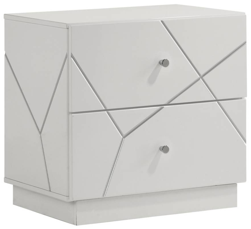 The Esther nightstand features a white and silver high gloss finish, two drawers, and a modern geometric design. Elegant and contemporary, it brightens bedrooms with luxe style and subtle illumination.Read More