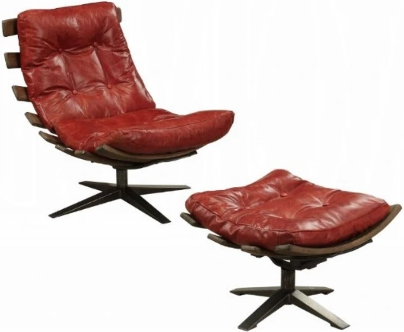 The ACME Gandy chair and ottoman set features an armless lounge chair and matching ottoman upholstered in distressed antique-red top-grain leather with button tufting. Supported by a slatted wood frame and four-star metal base, the chair swivels 360°, offering plush comfort with down-feather and foam cushions.Read More