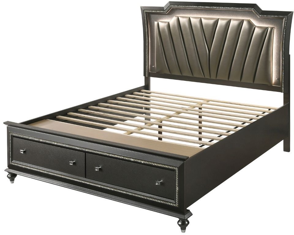 The Kaitlyn bed provides a commanding presence in any room. This contemporary storage bed features a channel tufted padded headboard and a low-profile footboard with storage drawers. Crafted with a glam look that is an ideal addition to any bedroom, the headboard is accented with LED lights and a crystal-like sparkling trim.