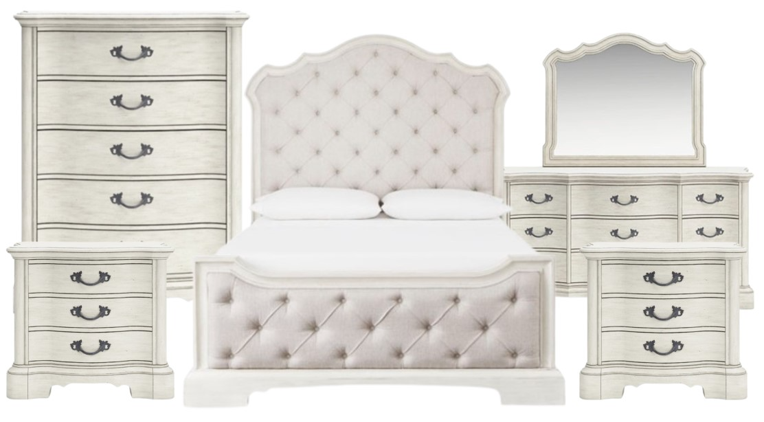 Add a touch of romance to your bedroom with this set. Its antiqued white painted finish and serpentine-shaped silhouette details are the picture of easy elegance. Drawers in multiple sizes offer ample storage space, while custom-designed bar pulls add originality.Read More