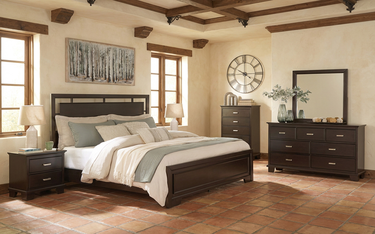 The Signature Design by Ashley® Covetown queen panel bedroom set showcases timeless elegance with its rich dark brown finish. Featuring a stylish panel bed, matching dresser, mirror, chest and nightstand, it blends classic design with modern functionality for a luxurious bedroom ambiance.Read More