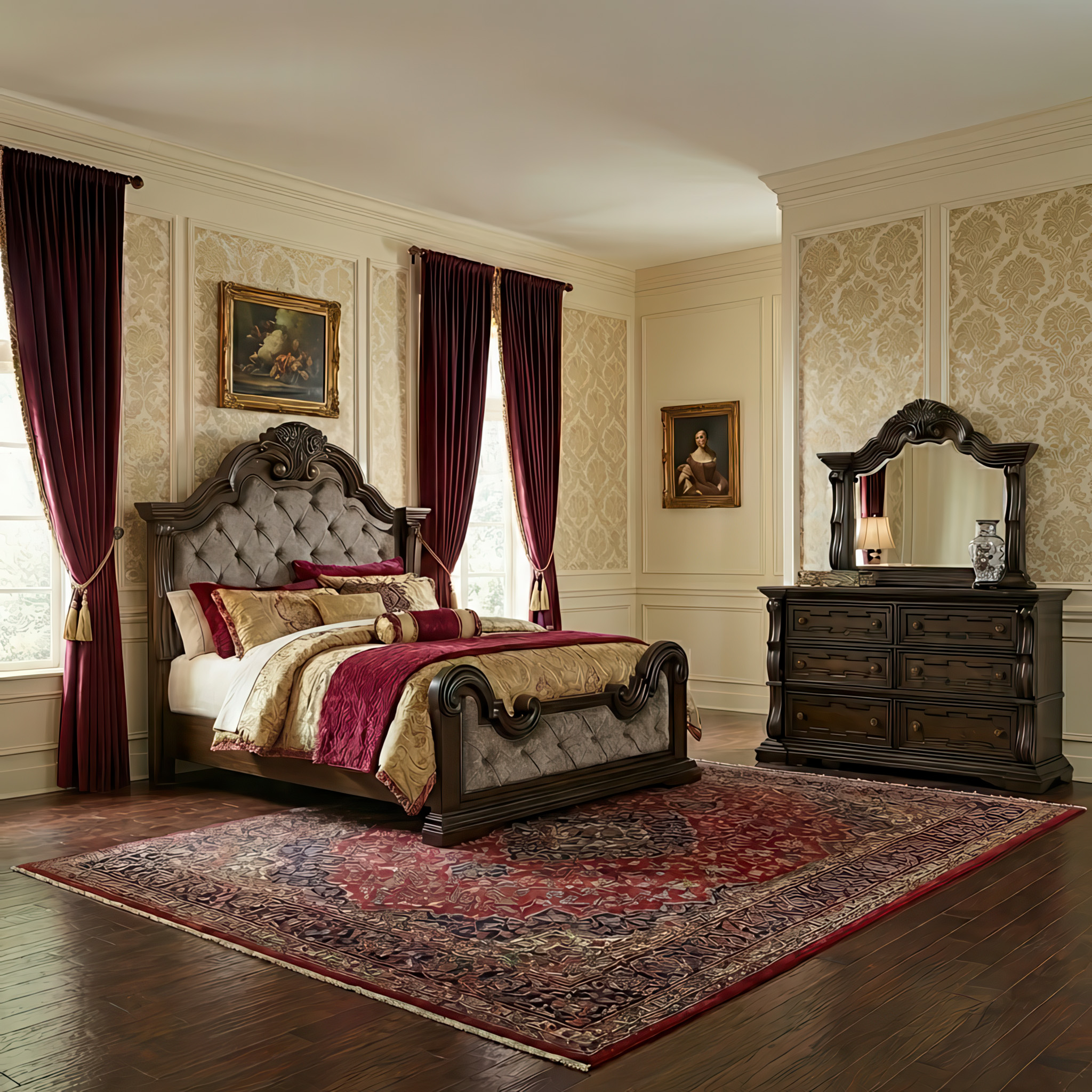 Looking for a bedroom set that combines comfort with classic beauty? The Maylee collection offers the best of both worlds. With its deep wood tones and soft, beige upholstered accents, it brings warmth and sophistication to any room. This gorgeous collection features curvaceous detailing, a luxurious tufted headboard, and a dark, savory brown finish that demands attention. It’s traditional design done right.