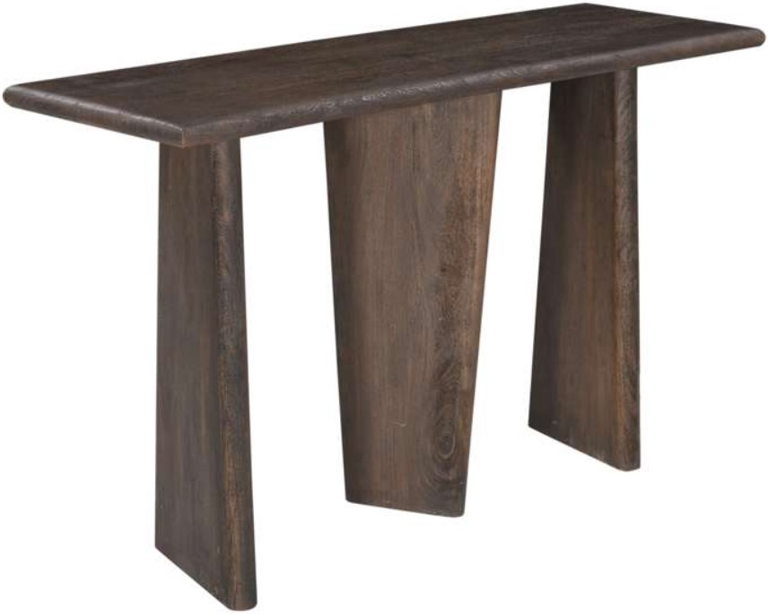 The Lasso console table features a modern organic inspired design. The thick, soft-edged table top sits on a unique, offset tapered base design. This console table is constructed with solid mango wood that's been sandblasted for texture with a deep, antiqued brown stain that highlights the features of the natural wood.Read More