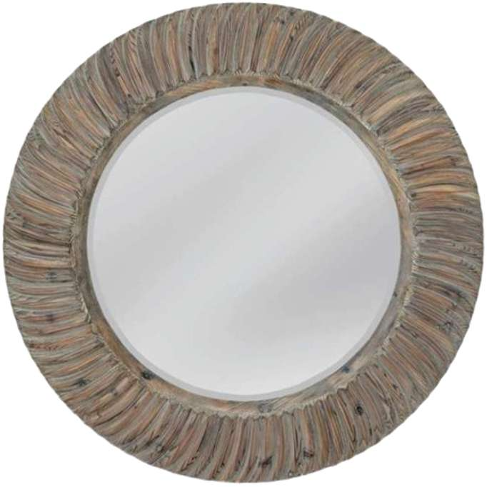 The Drift wall mirror is round featuring a radiating curved design and is weathered greige in color