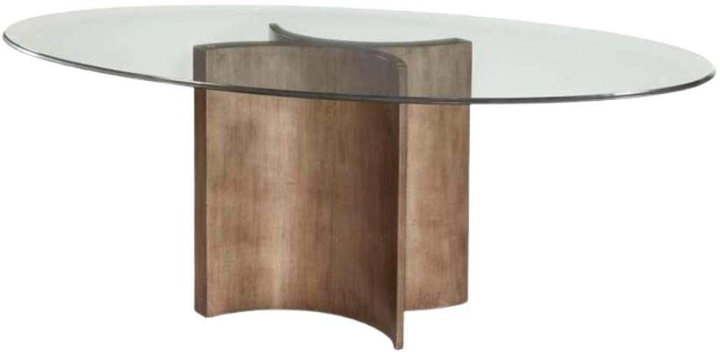 The Symmetry Dining Table features a modern sculptured base in antiqued silver leaf finish with gold wash to give the appearance of patinated Bronze. Tapered cylindrical arcs are conjoined to form the base, with beveled lay-on scratch resistant top glass. Bold, Modern, understated.Read More