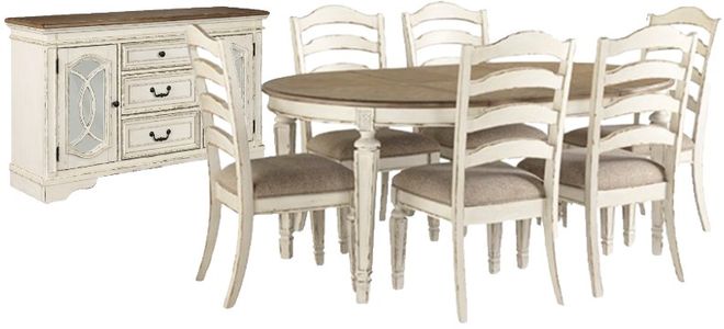 The Ashley® Bolanburg dining table set with chipped white finish offers charming farmhouse style with a weathered look. Featuring a spacious table, four upholstered chairs, and a sideboard, it blends rustic appeal and comfort, creating a warm, inviting dining experience.Read More