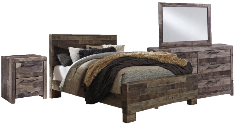 The Benchcraft® Derekson 6-piece queen panel bedroom set in multi gray finish offers a stylish, modern rustic charm. Featuring a queen panel bed, dresser, mirror, and one nightstand, it combines plank-style detailing with durable construction for lasting comfort and appeal.Read More