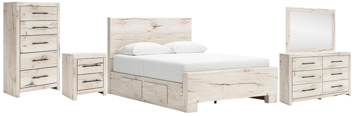 Set includes queen panel bed, nightstand, chest, dresser and mirror