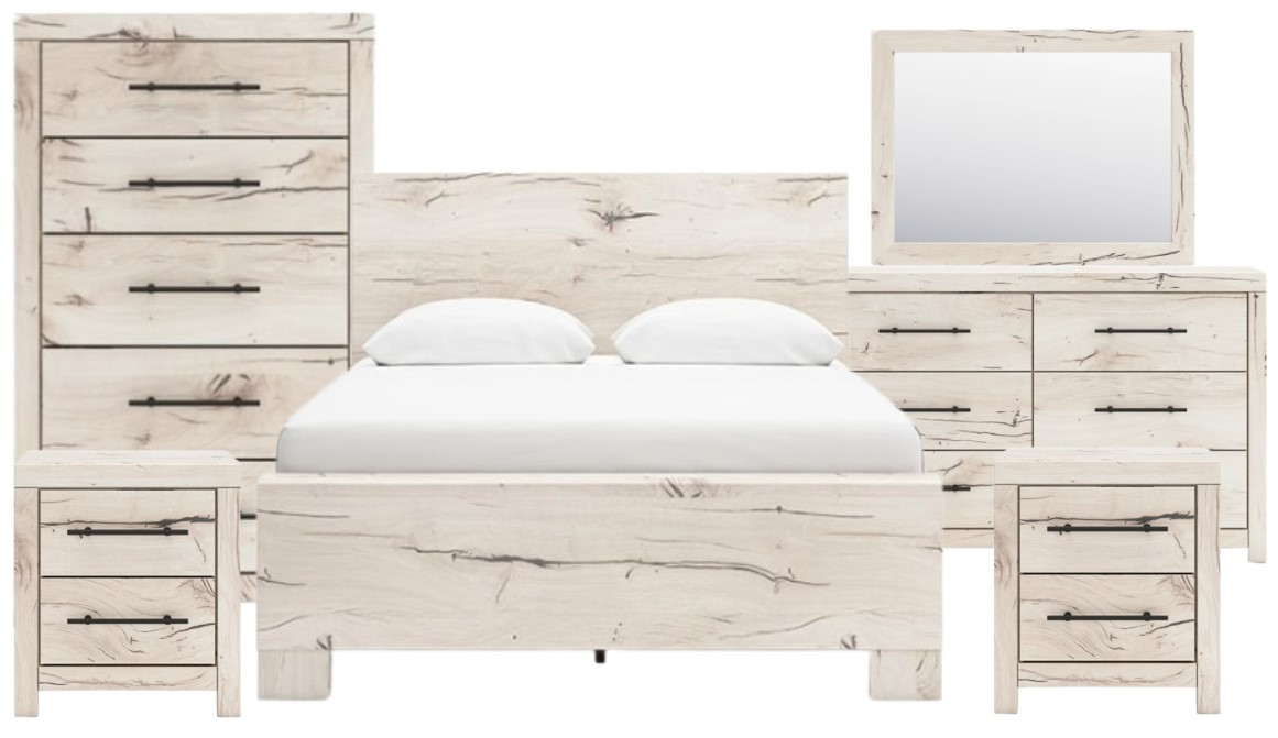 Set includes king panel bed, nightstand (2), chest, dresser and mirror