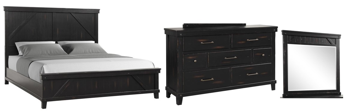 This bed features a bold and rustic design with a distressed black finish, giving it a modern farmhouse appeal. The high, paneled headboard is detailed with a classic farmhouse element, while the matching low footboard provides a balanced look. Constructed with sturdy wood, this bed exudes durability and timeless style.