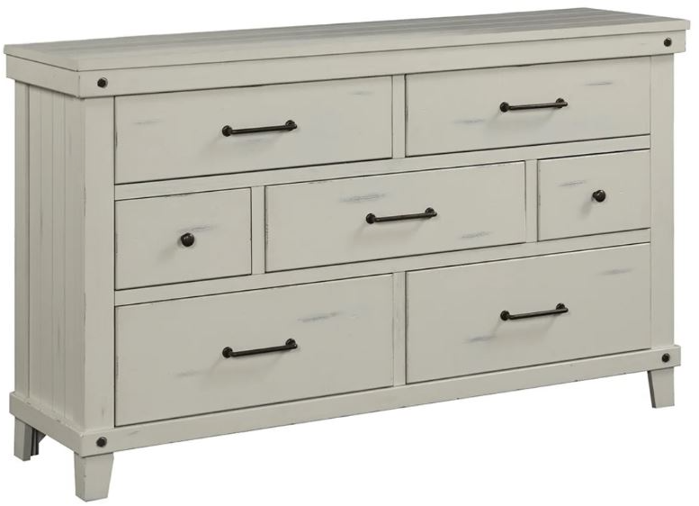Transform your bedroom into a chic, modern farmhouse retreat with our Spruce Creek Dresser in distressed white. The 7 spacious drawers, accented by side paneling and black industrial hardware, provide ample storage while adding a touch of rustic charm. Elevate your space with this eye-catching piece!Read More