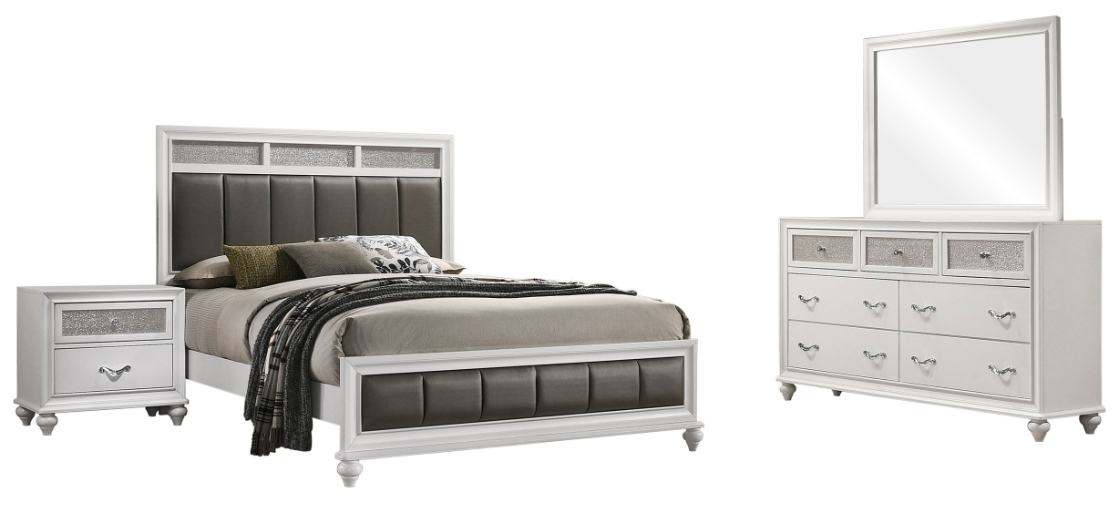 Transform your bedroom with the elegant design of this white set. The panel bed showcases metallic leatherette channel tufting framed by crisp molding and finished with turned feet for timeless charm. Coordinated storage brings added sparkle with glittery acrylic panels and faceted crystal hardware, blending modern radiance with classic details.Read More
