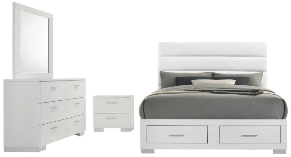 Transform your bedroom into a modern oasis with this sleek bedroom set, blending contemporary design with practical functionality. Anchored by a stunning upholstered bed wrapped in white faux leather, the set exudes a minimalist aesthetic complemented by clean lines and high-gloss finishes. Spacious case pieces, including a nightstand, dresser, dresser mirror, and optional chest.Read More