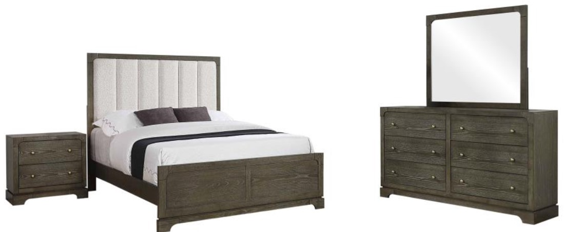 Includes: One (1) California king bed, one (1) nightstand, one (1) dresser, and one (1) dresser mirror