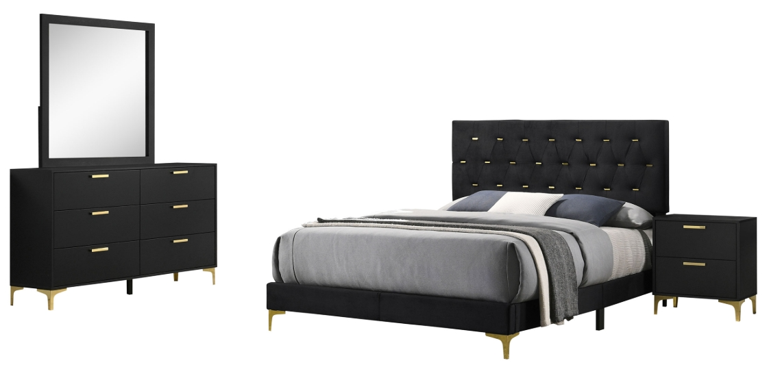 Transform your bedroom into a sophisticated retreat with this modern glam bedroom set. An upholstered bed with a diamond tufted headboard creates a cozy resting place. The smooth, black finish of the two-drawer nightstand and six-drawer dresser lends a chic and clean aesthetic, contrasted only by the gold finished hardware.Read More