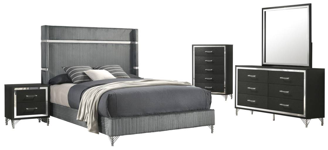 Gleaming hints of chrome bring shiny coolness and elegance to a five-piece modern bedroom set. Designed to impress, it boasts a wingback bed with gray velvet upholstery and a fluted look that delivers impressive depth and dimension. Its low footboard rail creates an open, airy silhouette, perfect for a compact space.Read More