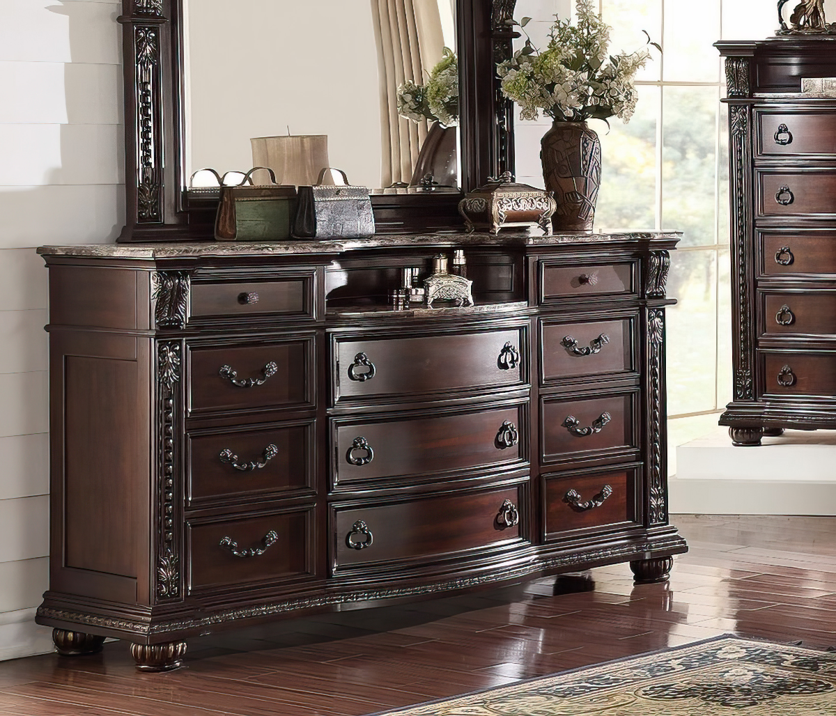 With opulent traditional charm, this bedroom group will make a great addition to any home. The Stanley Collection has copious details such as bun feet, ornamental pilasters, marble tops, crown molding, and a stately sleigh with an upholstered headboard panel. Incorporate your dream bedroom with this dresser and other Stanley collections.Read More
