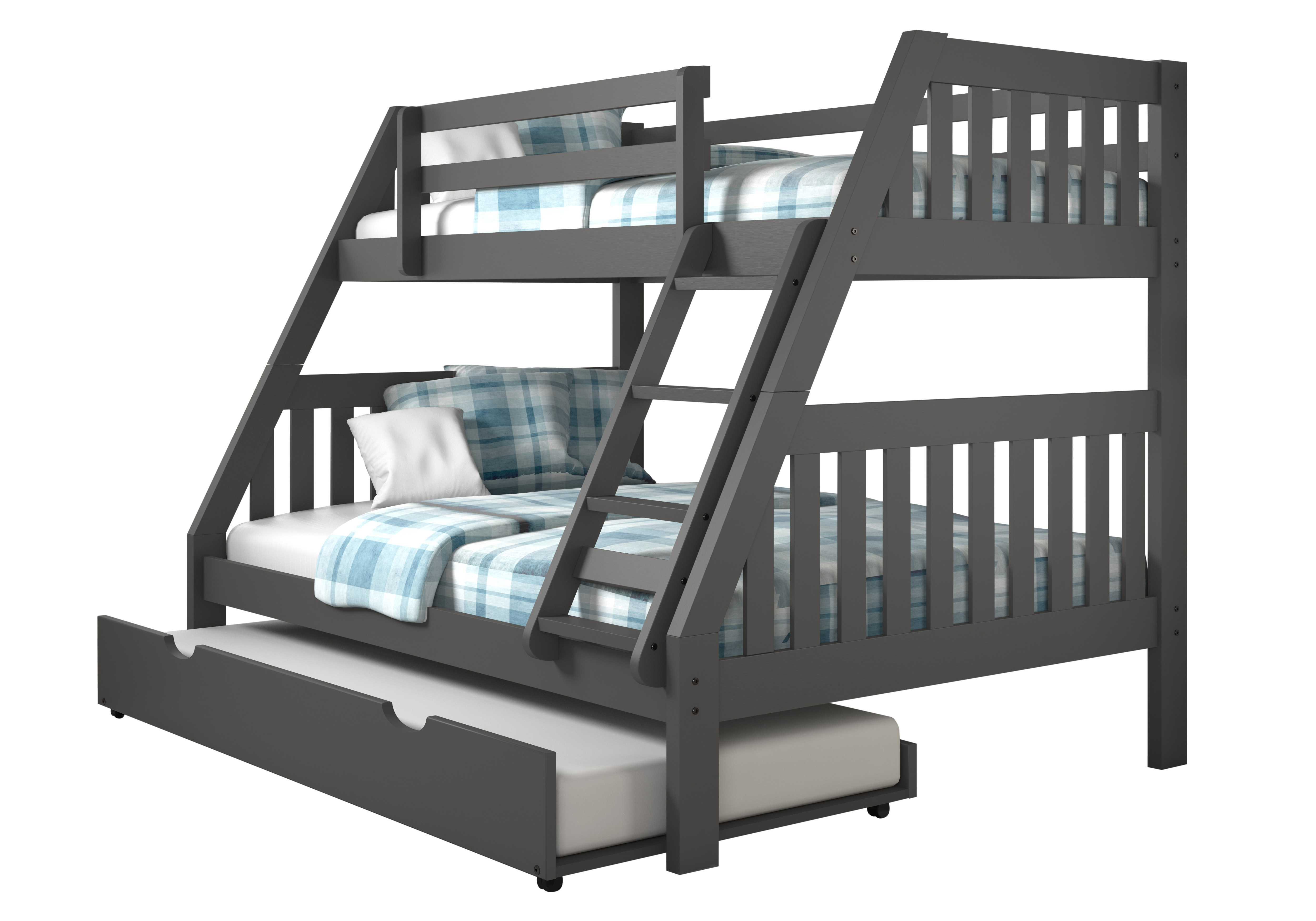 The classic mission design of this twin over the full bed has a grown-up appeal for your maturing child. The dark grey finish pairs well with any decor. The solid wood construction of this bunk bed provides outstanding durability. Also included is a twin trundle for added sleeping options.Read More