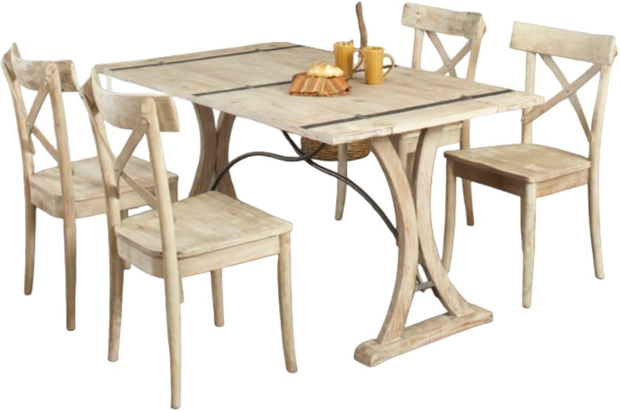 A rustic take on contemporary, the Callista offers a clean-lined silhouette and a weathered finish. The cross back chair adds to the inviting look with a farmhouse flair. The rectangular table sits on a trestle base and is crafted from solid pine and manufactured wood.Read More