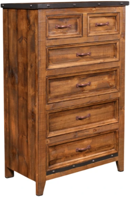 Soft industrial rustic look in solid pine construction. Powder coated finish on all metal banding and decorative nails. Full extension glides on every drawer. Burnished lacquer finish provides the perfect urban rustic feel. Mortise tenon joinery on every case piece.Read More