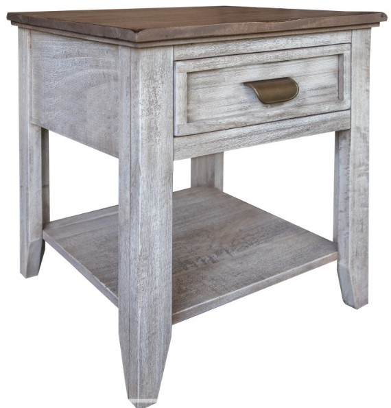 Shown in a two-tone finish, the Sahara End Table has one drawer and one shelf. Its drawer can be used to store your essentials while the lower open shelf provides ample amount of room for an organizing bin, home décor, or stack of books. You will love this piece in your home.Read More