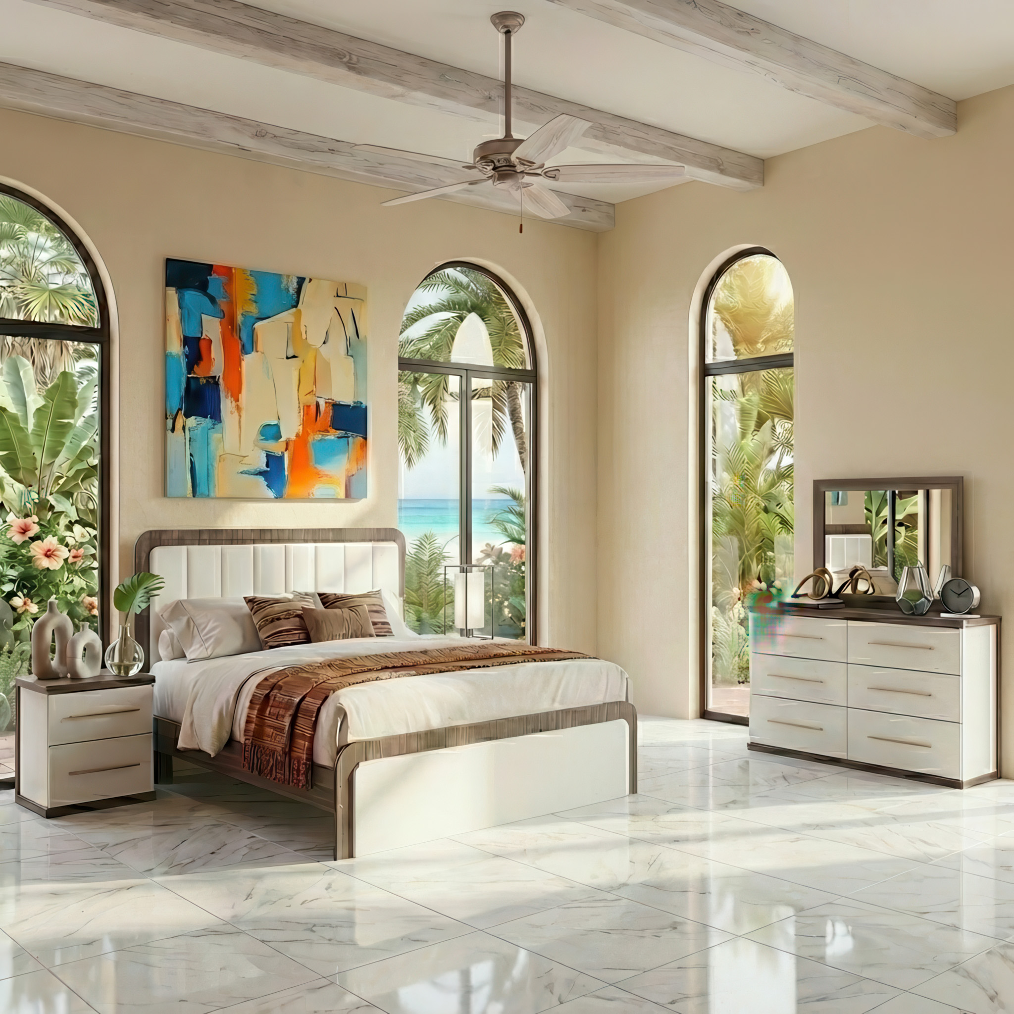 4 piece group includes a Queen Bed, 6 Drawer Dresser, Mirror and 2 Drawer Night Stand