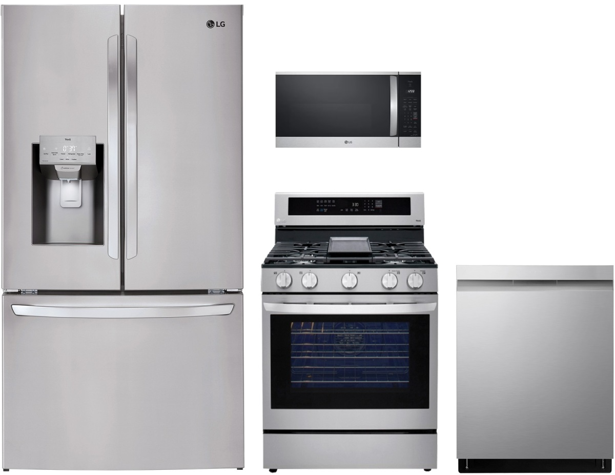 LG 4 Piece PrintProof™ Stainless Steel Kitchen Package with French door refrigerator, built in dishwasher, freestanding gas range and over the range microwave.Read More