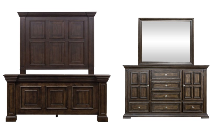 Live life beautifully with the Big Valley queen panel bed, dresser, and mirror. Crafted of rubberwood solids with birch veneers this kit features a brownstone finish with heavy distressing, wood framed doors and drawers, graduated bead molding creating architectural interest.Read More
