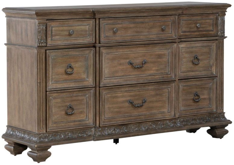 Indulge in luxury with the Carlisle Court nine drawer dresser. Crafted with excellence using rubberwood solids and rustic hickory veneers, this dresser features a chestnut with gray dusty wax finish. Breakfront styling and carved corbels accent the fluted pilasters.Read More