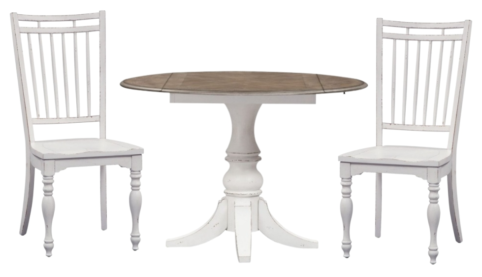 Sitting pretty with the Magnolia Manor optional three-piece drop leaf set, consisting of two spindle back side chairs and one drop leaf table. Crafted of poplar solids and white oak birch veneers, this kit features an antique white finish with a weathered brown top with whitewash.Read More