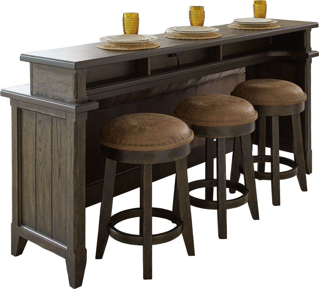 Includes the console bar table and three upholstered console stools