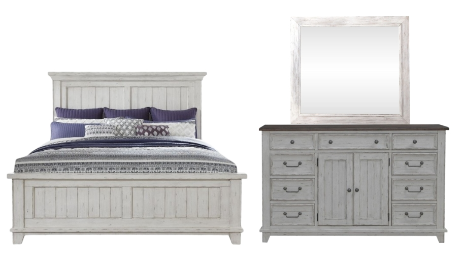 Create a room of your own that provides the perfect start and end to every day with the River Place king panel bed, dresser and mirror. Crafted with excellence using Pine solids and veneers, this set features a heavily distressed two-tone Riverstone White and Tobacco finish.Read More