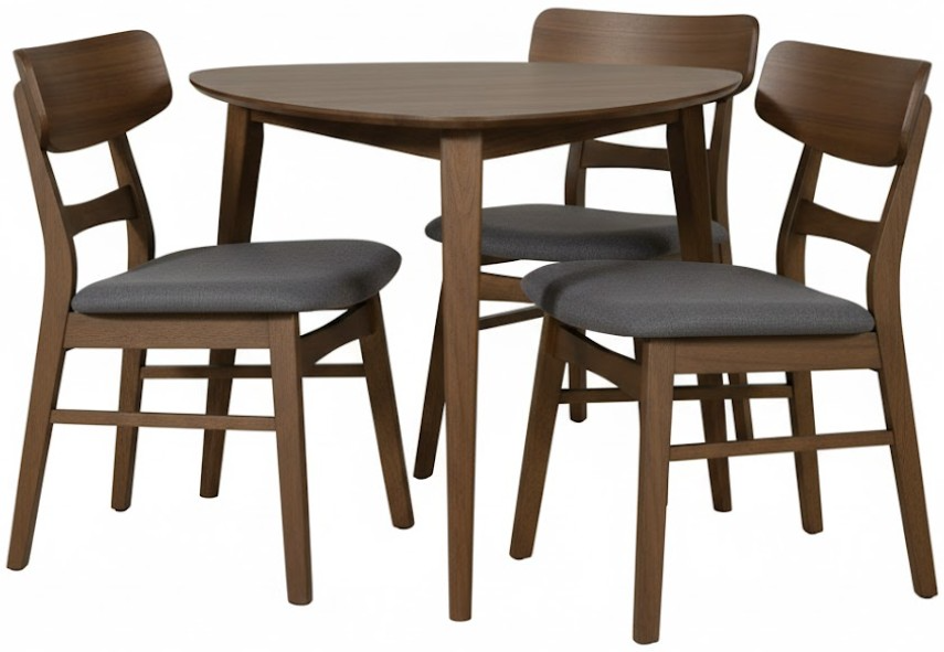 Do not sacrifice style while saving space with the Space Savers four-piece triangle table set. This set features a satin walnut finish and consists of the triangle table and three panel back side chairs. The triangle table is a unique shape and features beautifully splayed tapered legs with a softly rounded edge.Read More