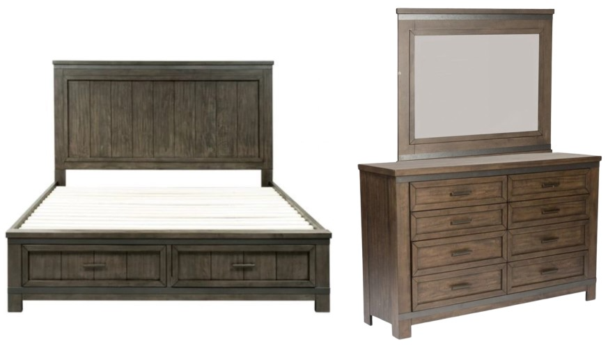 Elevate your home with the Thornwood Hills king storage bed, dresser, and mirror. Crafted of rubberwood solids with mango veneers, this kit features a rock beaten grey finish with saw cuts, straight line cases with wide pilasters and block feet, metal strip accents, planked tops and side panels, wood framed drawer fronts.Read More