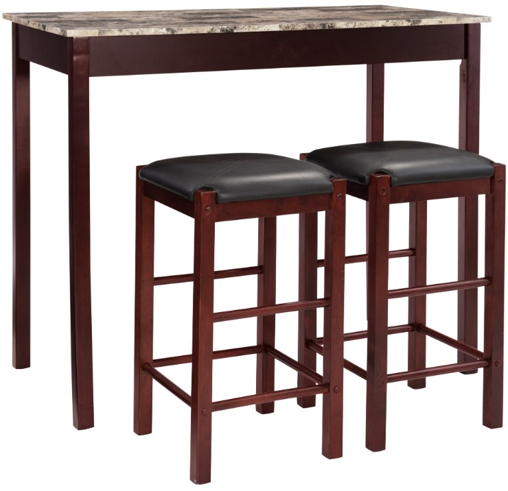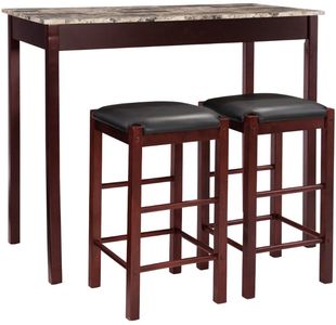3-piece counter set with space saving convenience. This set features a elegant rectangular table on long sturdy legs with two backless counter height stools with padded, black faux leather upholstered seats. Made from solid woods and a faux marble top.Read More