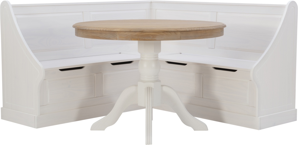 The seats open up to reveal hidden storage for extra placemats or seasonal decorations. Well thought out details like rounded edges are both good looking and practical for households with little ones. The farmhouse feel is finished off with a magnificent two tone round dining table.