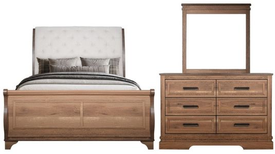 Set includes a queen panel bed, dresser and mirror