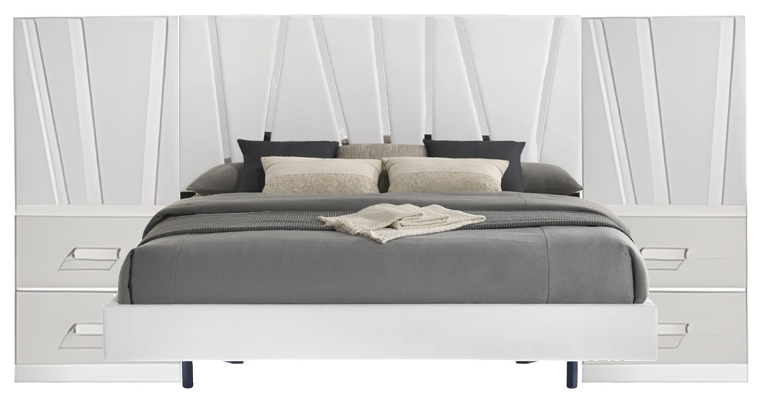 The sophisticated look is achieved by the combination of the majestic headboard, glossy white finish, acrylic drawer pulls and modern mylar accents.
