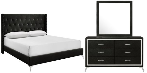 The Huxley bedroom set combines sleek modern design with timeless elegance. Featuring a bold black finish, the set includes a king panel bed, dresser, mirror, and nightstand, offering both style and functionality.Read More