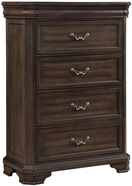 Rich Walnut Finish: The heirloom finish is achieved through a multi-step process that includes mild distressing, burnishing, and charcoal glazing that enhances the natural beauty of the wood
