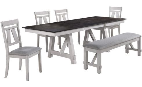 Includes: (1) dining table, (4) side chairs, (1) bench