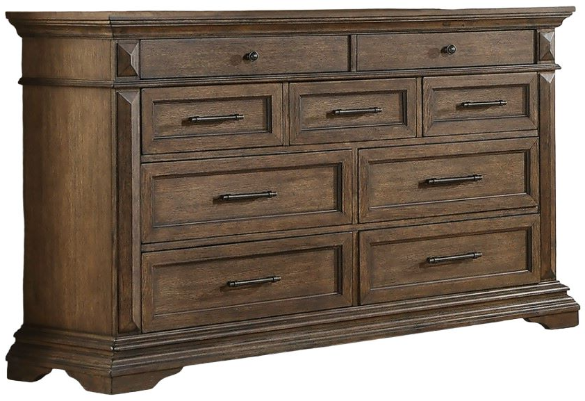 Rich Walnut Finish: The heirloom finish is achieved through a multi-step process that includes mild distressing, wire brushing, and charcoal glazing that enhances the natural beauty of the wood