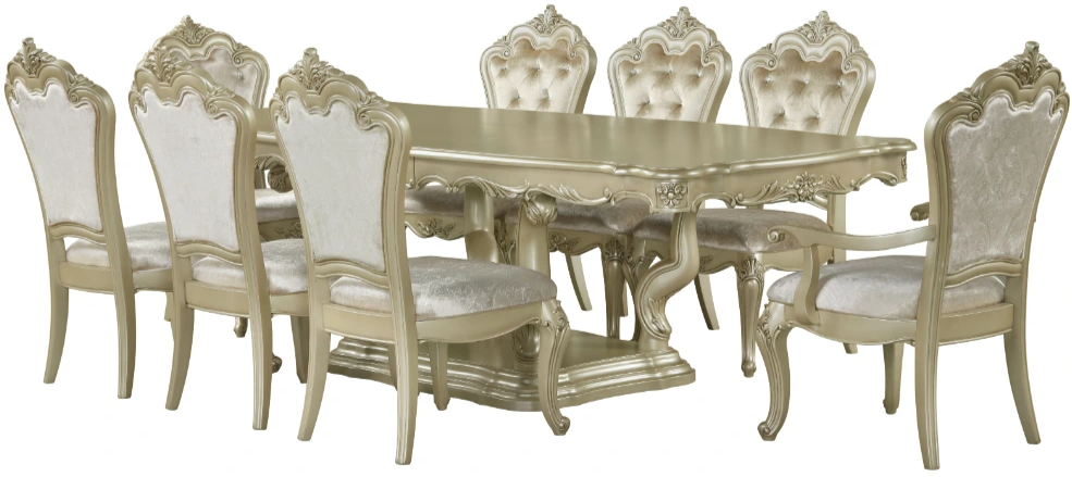 Elegant Traditional Styling: The intricate detailing, ornate carvings, and luxurious upholstered chairs with tufted backs are characteristic of classic Baroque furniture, which is known for its opulence and grandeur. The curved lines and elaborate design elements enhance the sophisticated and elegant look, making it a striking centerpiece for any dining room