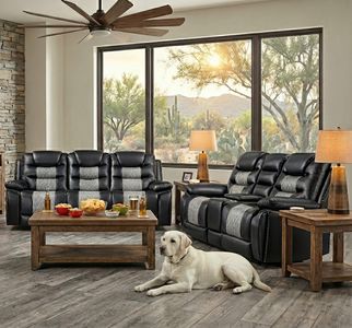 Enjoy luxurious comfort with resilient foam cushions and pocket coil support, providing a cozy place to lounge. The two-tone black and gray fabric, made from 80% polyester and 20% PU, gives the soft touch and look of leather while being breathable. This sofa stands out with distinctive details like nailhead trim, diamond stitch pattern seats, double wrapped headrests, and expert tailoring. Practical lifestyle features include a center back cushion that conveniently drops down into a snack tray complete with beverage holders, and hidden pull-out cupholders discreetly housed under the armrests. Keep your devices powered up with USB charging ports. Plush pillowed arm and headrests, reclining backs, and comfortable footrests provide the ultimate place to unwind. Find your perfect recline position with a touch of the power button. Transform your living space with the Nikko Dual Recliner Sofa and enjoy unparalleled comfort and style in your home.