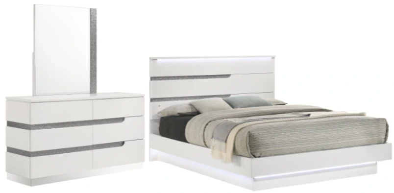 Glitz and Glam: The ambient glow of the LED lighting on the platform and headboard reflect the modern white finish and the glittering silver mylar inlays