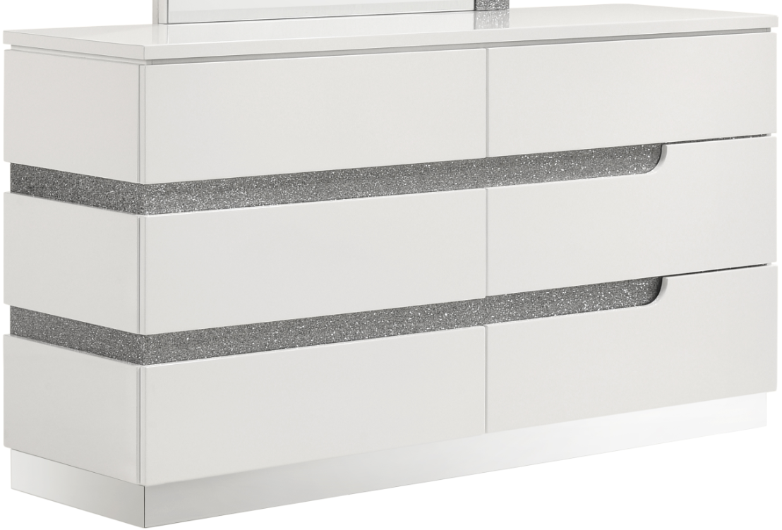 The Paradox Six Drawer Dresser in white combines contemporary appeal with robust functionality. Its gleaming white gloss laminate finish offers a sleek, modern look while providing the practical benefits of scratch and water resistance. Crafted from a combination of solid and manufactured woods, this dresser ensures long-lasting durability.Read More