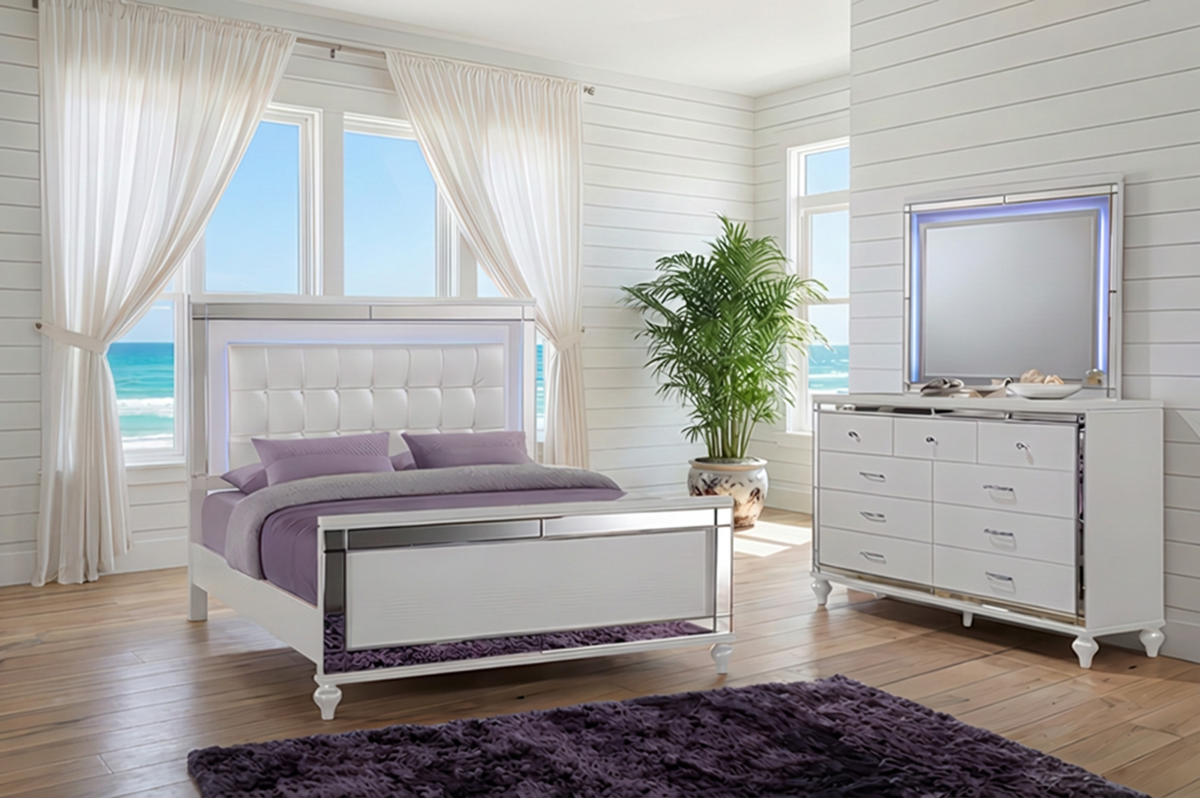 The Valentino bedroom set in white is an exquisite collection designed to elevate your South Texas bedroom into a luxurious sanctuary. All pieces are meticulously crafted from a combination of manufactured and solid woods with decorative embossed inlays, ensuring long-lasting quality and distinctive style. If you're a fan of white glam with LED lighting and mirrored accents, then the Valentino bedroom is for you. As one of our best-selling sets, Valentino isn't just furniture; it's a versatile style statement that grows with your family.Read More
