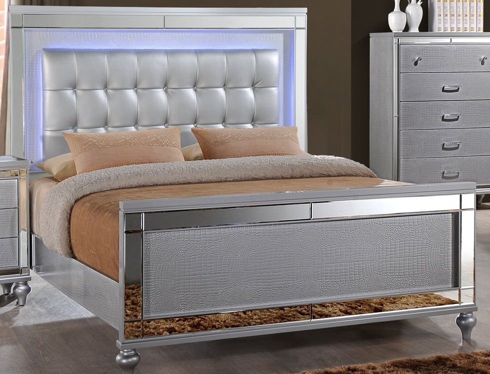 Featuring a lighted and upholstered headboard, the Valentino collection is brimming with features. Embossed inlays, mirrored borders, and turned feet all add to the unique styling of this suite.Read More
