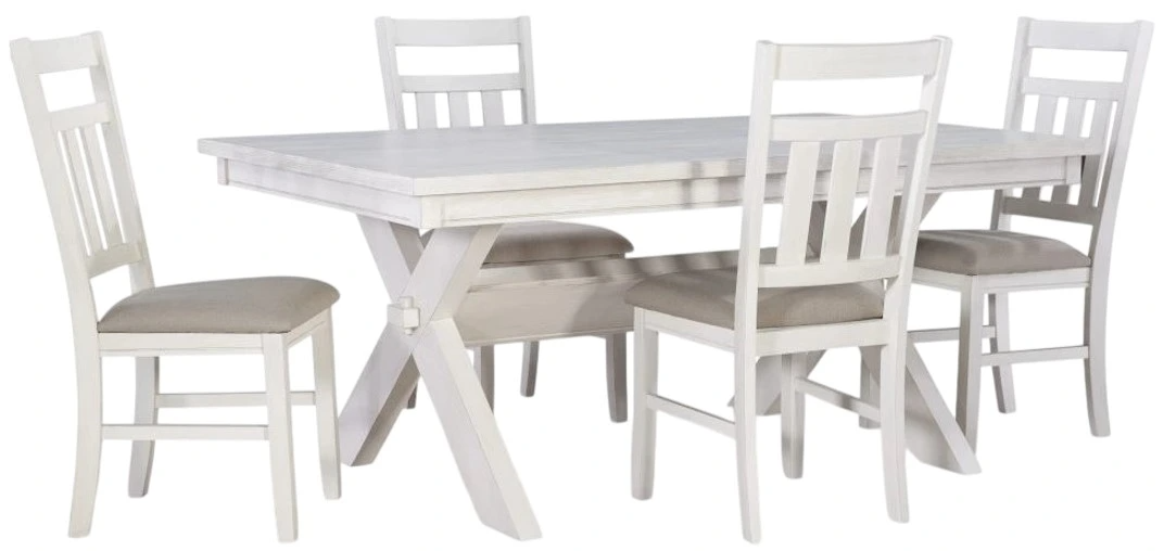 With an effortless blend of style and support, this handsome, wooden, five-piece dining set includes a plank-style table with a bold, X-shaped base, plus four dining chairs. The chairs each feature a sturdy base and foam-padded seat to create a comfortable foundation for your dining enjoyment.Read More