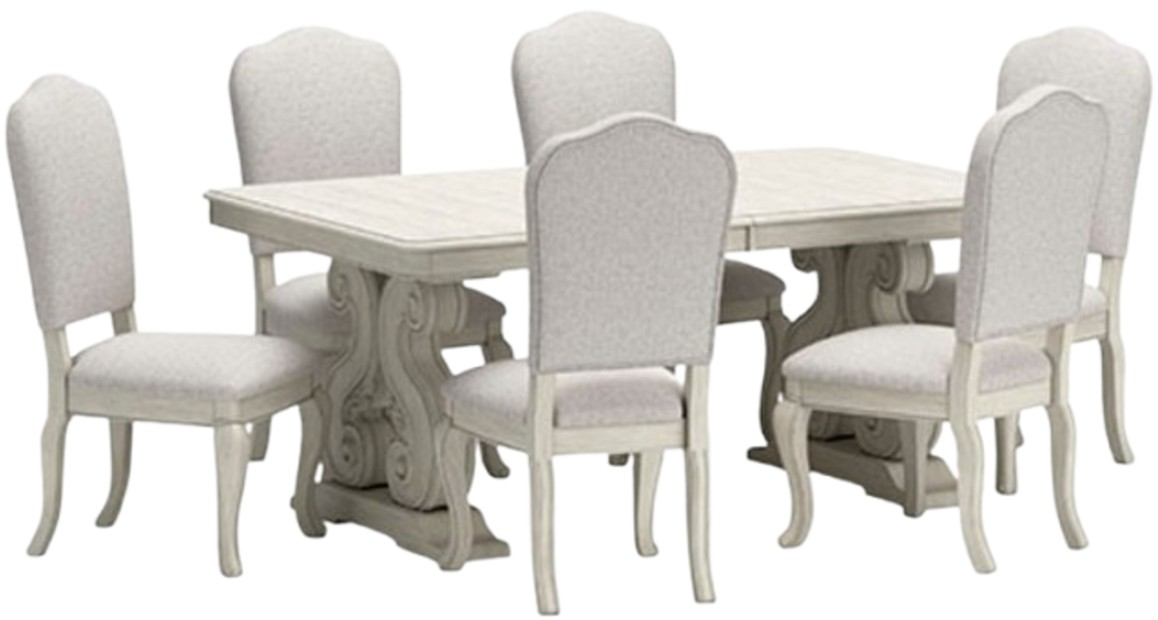 The Ashley® Arlendyne 8-piece dining table set with antique white finish offers timeless elegance, featuring a spacious table base and top, six upholstered chairs. Its intricate detailing, classic charm, and sturdy craftsmanship create a refined centerpiece for memorable dining gatherings.Read More